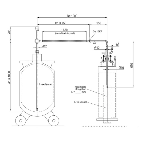 主要用來(lái)從大型液氦杜瓦瓶傳輸液氦至小型液氦杜瓦瓶,或者從用液氦杜瓦瓶為核磁做補(bǔ)液使用。根據(jù)客戶具體用途定制柔性管路和硬管具體長(zhǎng)度。